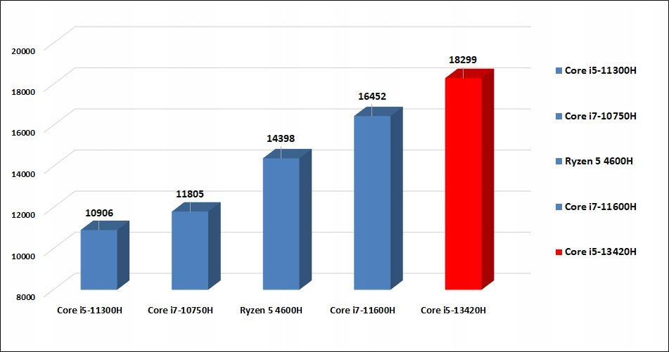 - Wydajny procesor 12-rdzeniowy Raptor Lake INTEL 13-GENERACJI Core i5-13420H (4E+4P) Turbo 4.6GHz to prawie dwukrotnie wyższa wydajność w stosunku do i5-11300H, mocniejszy od i7-11600H. Intel i5-13420H gwarantuje obniżone zużycie energii. Dzięki technologii Hyper-Threading do dyspozycji mamy 12 rdzeni logicznych (wątków) w systemie operacyjnym Windows.