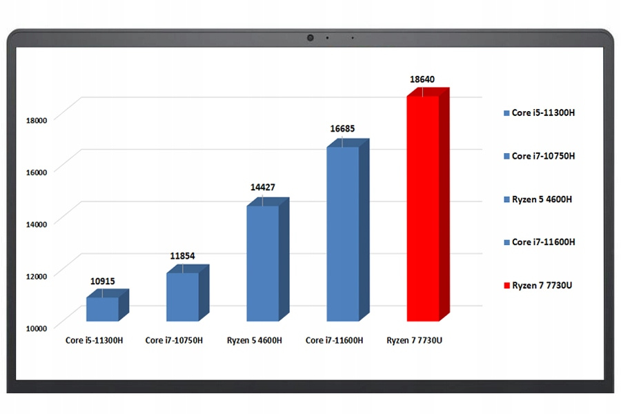 - Wydajny procesor ośmiordzeniowy AMD Ryzen 7 7730U 8 x 2.0GHz + tryb TURBO 4.5GHz to ponad 50% wyższa wydajność w stosunku do i7-10750H. AMD Ryzen 7 7730U gwarantuje obniżone zużycie energii, co pozwala na dłuższą pracę na baterii. Dzięki technologii SMT do dyspozycji mamy 16 rdzeni logicznych (wątków) w systemie operacyjnym Windows.