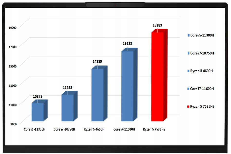 - Wydajny procesor sześciordzeniowy AMD Ryzen 5 7535HS 6 x 3.3GHz + tryb TURBO 4.55GHz to ponad 50% wyższa wydajność w stosunku do i7-10750H. AMD Ryzen 5 7535HS gwarantuje obniżone zużycie energii, co pozwala na dłuższą pracę na baterii. Dzięki technologii SMT do dyspozycji mamy 12 rdzeni logicznych (wątków) w systemie operacyjnym Windows.